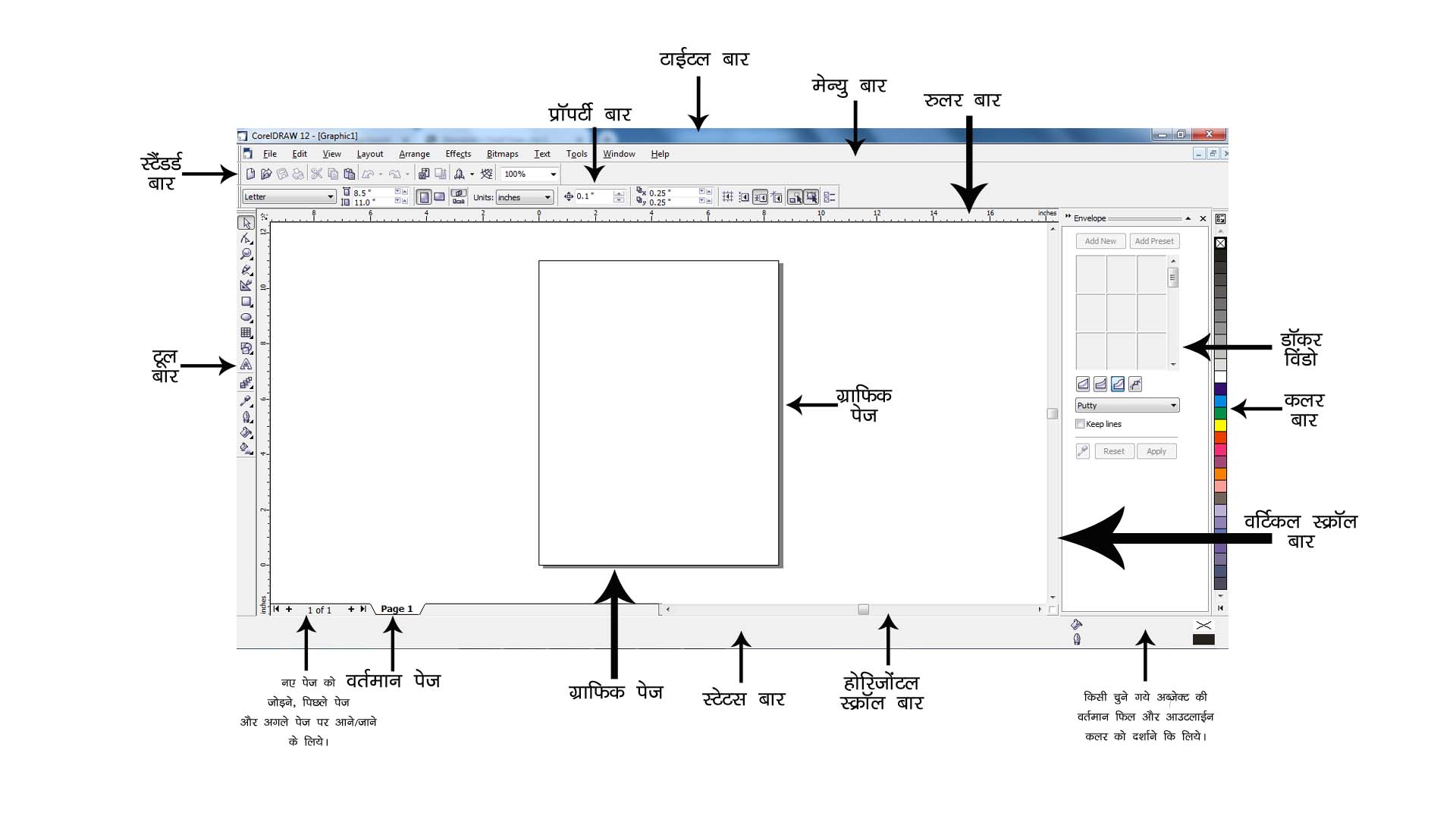 स्टेटस बार :- वर्तमान ग्राफ़िक पेज पर किये जा रहे कार्य की स्थिति की वर्तमान जानकारी प्रदान करता है.