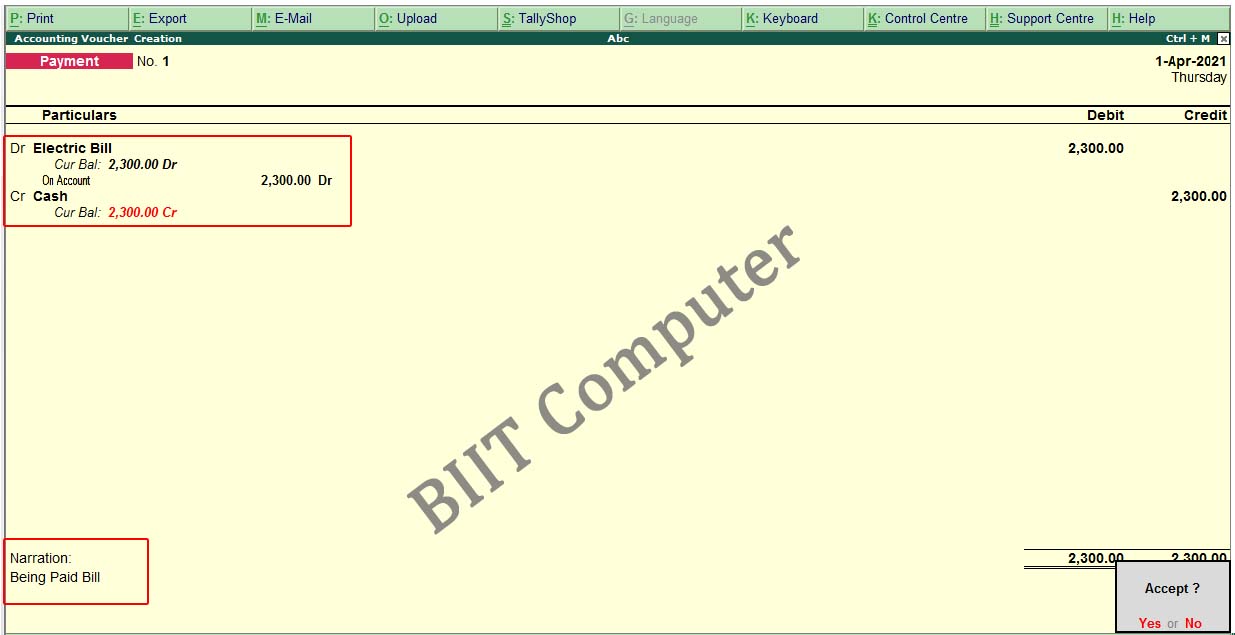 इस Voucher Type का प्रयोग व्यवशाय के ऐसे वित्तीय लेन-देनों, जो सिर्फ पैसे देने से संबन्धित होते है. उनकी Entry ईस Voucher Type में की जाती है. हम यहाँ देखेंगे की किस प्रकार से एक Transaction की पहले Ledger बनाई जा रही है और फिर उसका Voucher Entry किया जा रहा है.