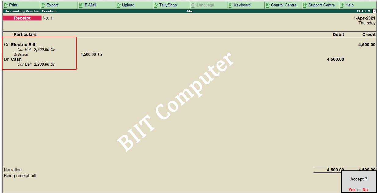 Gateway of Tally→Go into Account Voucher→Receipt (F6)↵