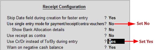 Note : यहाँ इस Receipt Voucher को खोलकर सबसे पहले “F12” फंक्शन की के द्वारा निचे दिए गए विकल्पों का पालन करें तब Voucher की Entry करें.