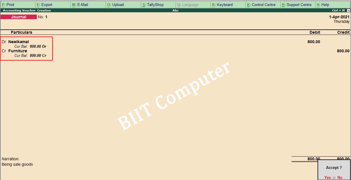इस बात का ध्यान रहे की इसमें दो पक्ष के Ledger तैयार किये जाएँगे. ध्यान रहे इस Voucher Type में सबसे पहले Dr. की एंट्री की जाएगी और दूसरी एंट्री Cr. की दी जाएगी.